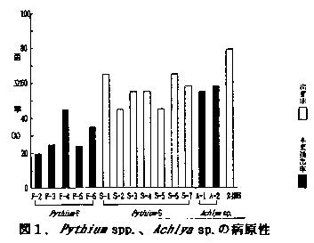 ②イネの幼苗に対する病原性は、Pythium-FがPythium-Sより強かった。着菌籾より分離されたAchlya sp.