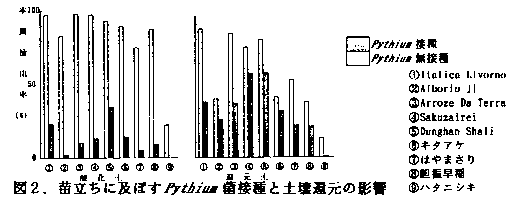 ②Pythium sp.無接種の場合、苗立ち率は還元土の方が酸化土より劣った。これは溶存酸素濃度が還元