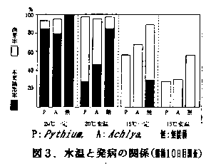 ③Pythium-F,Achlya sp.の遊走子接種は、苗腐病に対する抵抗性検定試験において有望であり、15℃