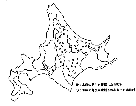 2)本病の発生は網走および十勝支庁管内の内陸部で多く見られ、道央地帯で確認されたのは追分町の