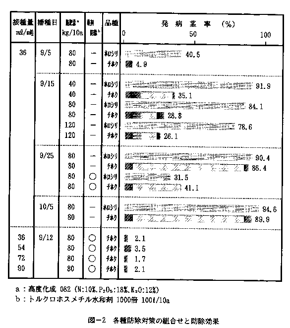 種が9月中旬以前の場合顕著であるが、9月下旬以降に播種した場合は、いずれの処理も多発すること