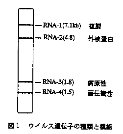 1)てんさいそう根病の病原ウイルス(BNYVV)には、4〜5種のRNA遺伝子が存在し、そのうちRNA-3が病原性、