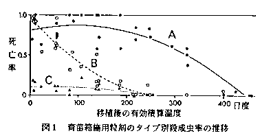 残効タイプ)、C(低殺虫力)の3タイプに類別し、施用後日数と温度から日殺虫率を求める式を設定した。