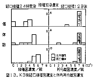 ③K3株の経口接種の場合、虫体内接種菌濃度は接種菌液濃度が濃いほど、また接種時間が長いほど