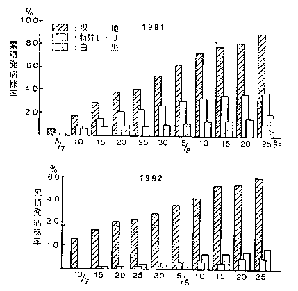 3.本ウイルスは主として保毒モモアカアブラムシ有翅虫の飛来による吸汁が第1次感染に大きく関与している。