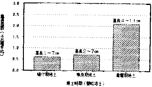 1)極早期培土(植付期、萌芽期)においては、培土後萌芽期(以下単に萌芽期)を5および8日遅らせることができるので、この間の霜害は回避できる(表1)。また萌芽後、霜害があった場合でも極早期培土では被害が軽減できる(図1)。
