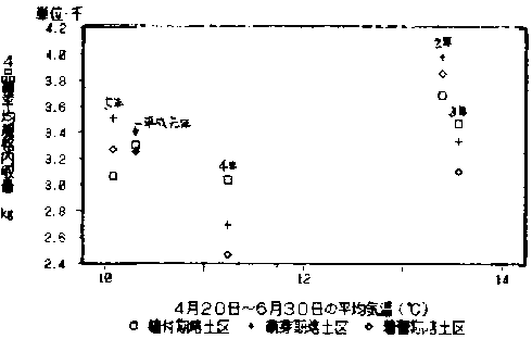 図2 生育初期気温の年次変動と終花期約3週間の規格内収量