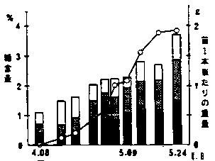 | 供試材料: | 供試品種「レオ」、1991年は4月8日〜5月24日、1992年は4月20日〜5月 21日にかけて経時的に苗をサンプリングし、成分変化を調査した。 |