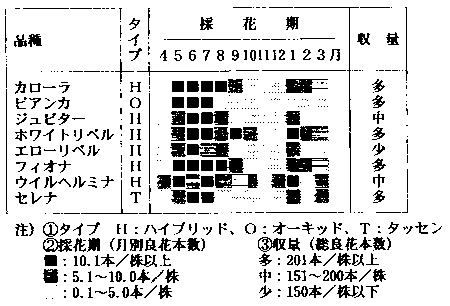 | ビアンカ: | 良品率が若干低い。花梗長が他の品種に比べて長かった。切花はボリュームが出 にくい。秋咲き性は低い。冬はブラスチングが多発。 |