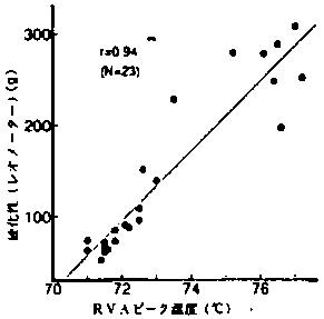 4)硬化性の測定を初期世代の育成材料に応用ナるためにオートアナライザーを用いる方法、RVAを用いる方法を開発した。この結果、1点約5分、4gの試料で精度良く硬化性を推定できると考えられた(図2)。