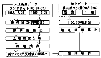 差を算出し地上データの易有効水分との関連を解析した。衛星データからの裸地の抽出手法、分光反射値の平均化処理等について、最適条件を検討した。得られた衛星データと易有効水分との関係から、対象地域全域の有効水分区分図を作成した。
