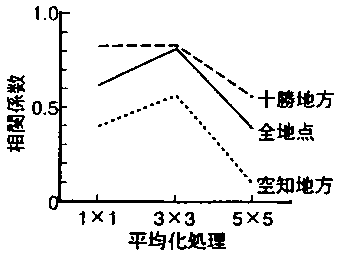 4)抽出された裸地について、易有効水分との相関を検討するときには、原画像に3x3画素の平均化処理を行うことによって、より高い相関が得られた(図2)。