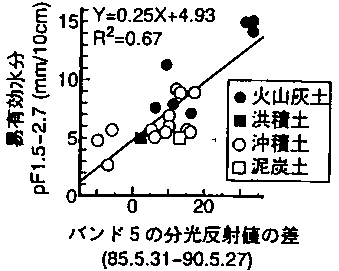 2)抽出された裸地について、畠中ら(1990)の手法を適用して、両年の分光反射値の差と表層10㎝の易有効水分(pF1.5〜2.7)との関連を検討したところ、中間赤外域であるバンド5で高い相関が認められた(表2)。