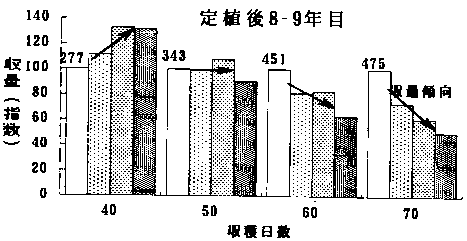 ②収量傾向は栽植後経過年数により影響を受け、比較的新しい圃場では収穫期間を短縮すると増加あるいは平衡であったが、古い圃場では収量は減少傾向にあった(図1)。