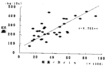 ⑤収量そのものは根のBrix値と根重を掛け合わせたものと高い相関があった(図2)。
