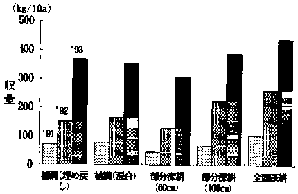 ①収量は初期より全面深耕区で最も高く、部分深耕100㎝が次に高収だった。植溝区および部分深耕60㎝区では低かった(図5)。
