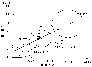 ⑥GIは一日当たりの収量と高い相関があった(図3)。