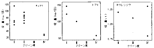 (2)トマト、ホウレンソウではクリーン度間の収量差が殆どなかった。一方、キュウリではクリーン度Ⅰ〜Ⅲに明かな差はなかったが、ⅣVでは大きく減収した(表1)。