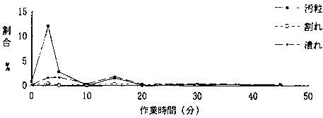 (6)汚粒調査:各試験毎のタンク内子実を300g調査し、一粒全面積の1/6以上汚れた子実を汚粒とした、また平成5年の能率調査時にタンク内子実をおよそ5〜10分おきにサンプリングし、上記基準で汚粒を調査した。