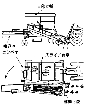 ①構造と特徴:コンテナを載せる台を作業機のフレームを利用したスライド台車構造とした。新たな作業工程は、コンテナが満杯になると、作業機後方の横送りコンベヤを引き抜きコンベヤ側を回転中心として後方に開き、中央部のコンテナ(550㎏)を後方にスライド移動させてフロントローダで荷役が行われる(図1)。空コンテナ(90㎏)の扱いもスライド台車で行うため女性1人の補助作業となった。1回の荷役サイクルタイムは80〜100秒で、満載コンテナを作業機の側方から扱う方式に比べ荷役正味時間は50〜110秒で同程度であるが、段取りや熟練度による時間の差が少なくなり、作業全体の時間では短縮した。