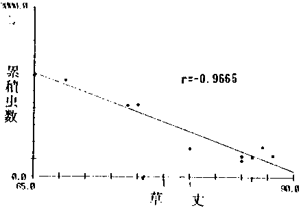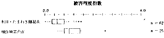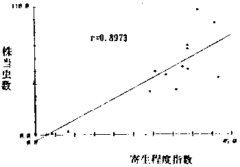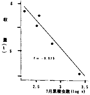 2)被害の程度は7月の累積寄生虫数と相関関係があり、7月の株当り累積寄生虫数が1,000頭(30頭/日)以上で顕著になる傾向があった(図3)。