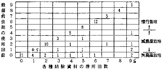 図3 本田防除における各種防除資材の使用回数と農薬の使用回数との関係