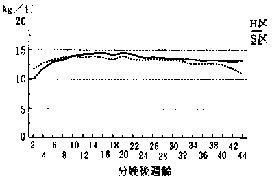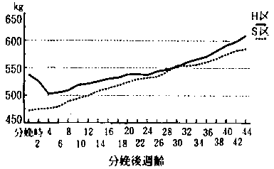 7)体重はS区では分娩後から分娩後44週齢まで一定割合で増加したが,H区では8週齢まで減少または停滞した後,緩やかに上昇し,泌乳後期には増体割合が高まった(図1)。