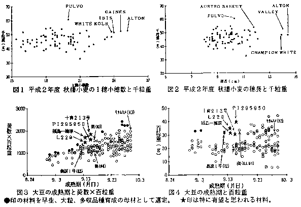 葉形、花色、毛茸の色、伸育型、開花期、成熟期、登熟日数、主茎長、倒伏程度、主茎節数、分枝数、莢数、百粒重、莢数×百粒重、種皮色、臍色、子葉色について変異を調査し、特徴的な材料を抜粋した。また、成熟期と莢数×百粒重、成熟期と百粒重の関係について検討し、早生、大粒、多収品種育成の母材として利用可能と思われる材料を抜粋した(図3、4)。他に、黒豆、青豆の成熟期と莢数×百粒重の関係について検討し、育種母材として利用可能と思われる材料を抜粋した。