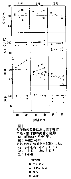 跡で後期に低下し、小麦跡では後期にやや高まった。小麦はばれいしょ跡で低く、菜豆跡で高かった。