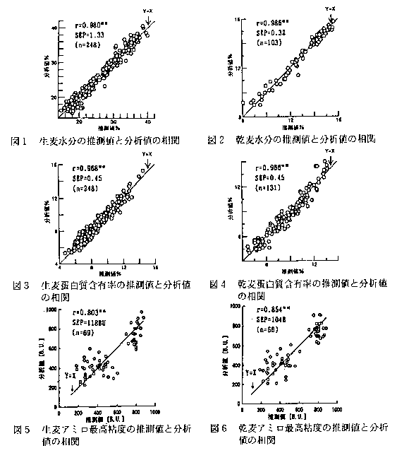 ②蛋白含有率については、生麦、乾麦ともに0.5%以下の推測誤差で推定が可能であった。ただし、乾麦