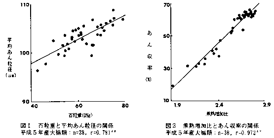 の中では、百粒重があん粒子の大きさを現す指標となり得るものと判断された。(図1)