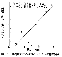 3)頂芽の深さが浅いものほど剥皮後の頂芽におけるトリミング数が少なかった(図1)。