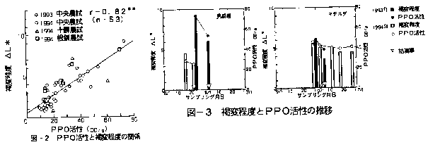 に影響を与える要因を検討したところ、ポリフェノールオキシダーゼ(PPO)活性が主要因であり、褐変程度