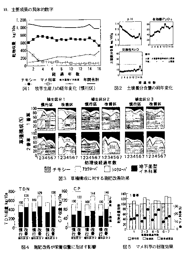 結果・改善区と比べて乾物収量はやや低下したが、マメ科草の回復に対しては明らかな効果が認められ、