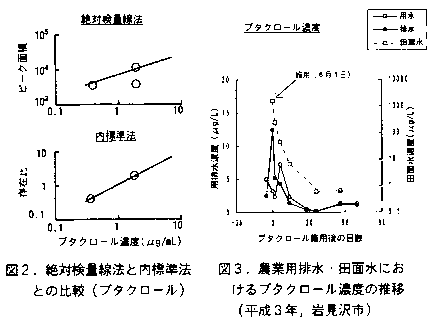 本試料中の水田除草剤濃度を簡易かつ迅速に測定するため、ガスクロマトグラフ質量分析計(GC/MS)の利用と、試料の前処理法を検討する。