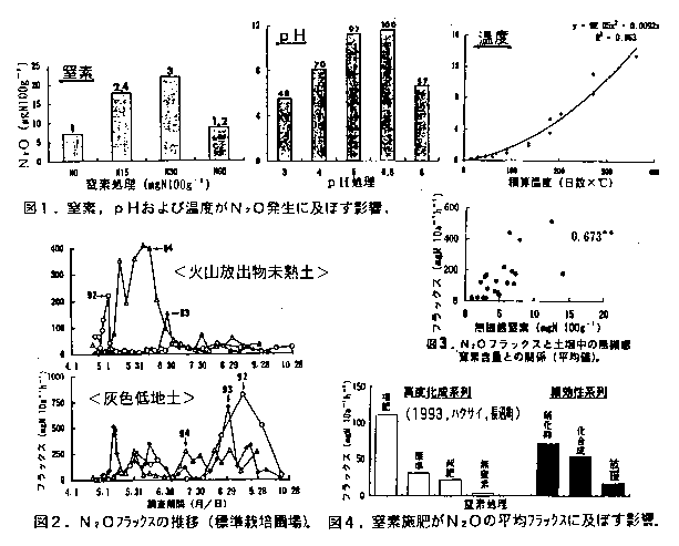 はなかった。しかし、平均値でみると、N2Oの発生は窒素施肥量や土壌中の無機態窒素含量と有意な
