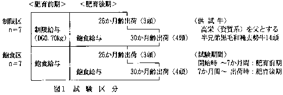 試験1では、肥育前期に飼料を制限給与し肥育後期に濃厚飼料を多給した飽食給与を行う方式と肥育開始時から濃厚飼料を多給した飽食給与を行う方式との違い、さらには26か月齢出荷と30か月齢出荷との違いが黒毛和種去勢牛の産肉性に及ぼす影響について検討した。また、試験2では、試験1で良いとされた方式が、増体能力が高いとされる、いわゆる増体系の種雄牛を父とした素牛を用いた肥育にも適用されるかどうかについて実証的な試験を行った。