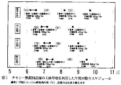 以上の結果に基づき、表1には熟期別のチモシー品種に対するマメ科草種・品種の混播組合せおよび播種量を示し、図1には熟期別のチモシー品種の主体草地を利用した年間の刈取りスケジュールを示した。