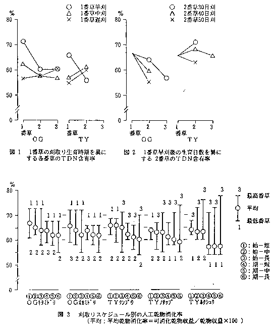 1-3)1番草早刈後、生育日数を30日、40日、50日と異にして刈取った2番草のTDN含有率は、OGでは30日刈の64%から50日刈の55%まで、TYでは30日刈の71%から50日刈の63%まで順に減少した。(図2)ただしTY30日刈の収量は極端に少なかった。