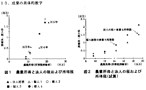 (3)1戸1法人の場合、法人化による税制面での有利性は家族構成や転作の程度により異なるが農業所得が1,200万円以下の経営では所得税に大差はなく、農業所得1,400万円以上の経営になって発現することが認められた(図1・図2)。したがって、恒常的に1,400万円以上の農業所得を形成する大規模経営において法人化による節税が作用すると考えられた。ただし、この場合にも転作奨励助成金の圧縮記帳が節税の条件となるので資金管理への配慮が必要である。