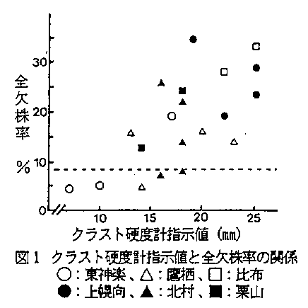 1)不耕起の移植精度は土壌硬度が高くなるにしたがって低下した。移植精度からみた適応土壌は、クラスト硬度計指示値(パネ定数:2㎏/40㎜)で15㎜以下であった(図1)