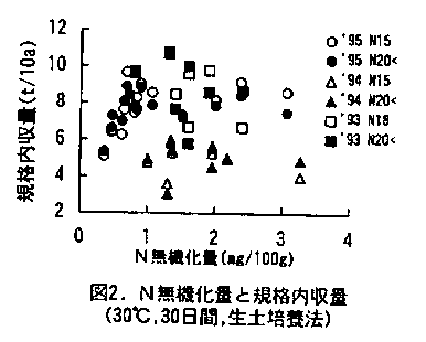 1mg/100g程度まで急激に増加し、1.5mg/100g程度以上では漸減傾向を示した(図2)②化肥窒素の増肥効果は窒素無機化量が0.5mg/100g以下で大きく、1.5mg/100g以上では化肥窒素の増肥によって漸減した(図3)。③生育後半に土壌窒素が旺盛に放出される泥炭土であっても、F1品種の特性から結球始期までに十分な茎葉量を確保するためには化肥窒素が15㎏/10a程度必要であった(表2)。