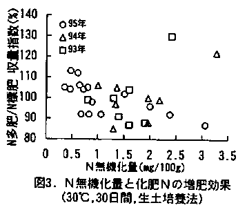 さらに、'94年春と'95年春の深さ0〜80㎝までの無機態窒素量は大差ないことから、吸収し残された施肥窒素の大部分は系外に消失したと推定した(表3)。