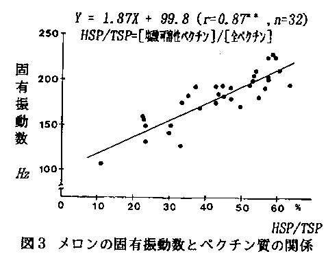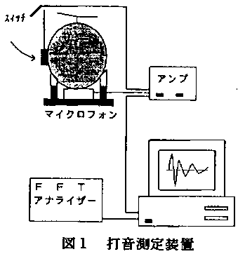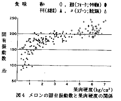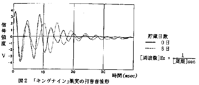 (2)打者解析による早熟果の判定果実の赤道部を打撃し、打者をマイクロフォンによってとらえ増幅後、高速フーリエ変換によって、固有振動数を求めた。固有振動数から果肉硬度の関係および早熟果の判定を行なった。