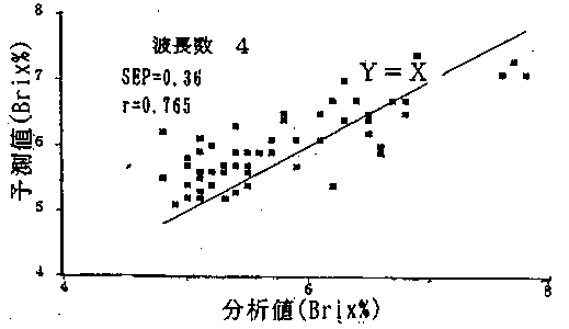 5)以上の手順を踏むことにより(糖度:a*値0〜16、酸度:a*値8.5以下、200g以下のトマトを対象とする)、反射型の近赤外分光分析計でトマト果実の糖度・酸度の測定を行った結果、トマトの糖度の測定が化学分析値に対して、±0.4%(相対誤差8%)以内の精度で推定できると結論された(図4)。