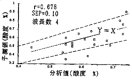 6)本法によるトマト果実の酸度測定は、化学的定量値に比較して±0.1%(相対誤差16%)前後の差があり、実用には精度不足と判断された(図5)。