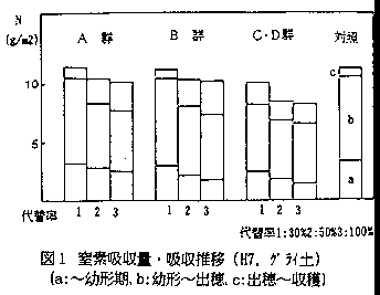 4)以上より、土壌中での窒素無機化が速く、生育初期より無機態窒素供給力の高い有機質肥料ほど化学肥料窒素の代替性が高いことが認められ(A群>B群>C群〉D群)、それらの化学肥料窒素代替性は、A群の有機物では30%、B群はA郡よりやや低く20%と推定された。