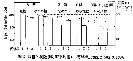 3)収量は、有機物区分ではA群>B群>C、D群の順に、代替率では30>50>100%区の順に高く、各処理区のうち、A群の30%代替区における収量は対照区(化学肥料)とほぼ同等であった。食味特性値としての蛋白含有率は有機物による代替率が高いほど高まる傾向であった。