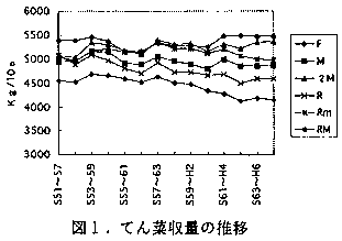 3)処理:化学肥料単用(F)、三要素+堆肥1.5t/10aおよび3.0t/10a連用(M、2M)、三要素+収穫 残さすき込み(R)、R+てん菜作付時のみ堆肥1.5t/10a(Rm)、R+堆肥1.5t/10a連用(RM) なお、F、M、2Mは収穫残さを搬出している。