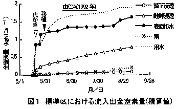 (4)標準区と減化区あるいは有機区との比較では、排水中全窒素濃度および窒素流出量に処理区間の明確な差は認められなかった(表2)。